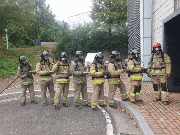 교육과 작업장 안전관리를 위한 소화기 작동법과 공기호흡기 착용 실습, 소방용 특수방화복과 공기호흡기를 착용하고 유류 화재 훈련장에 진입하여 화재를 진압하는 훈련까지 단계별로 실시했다.