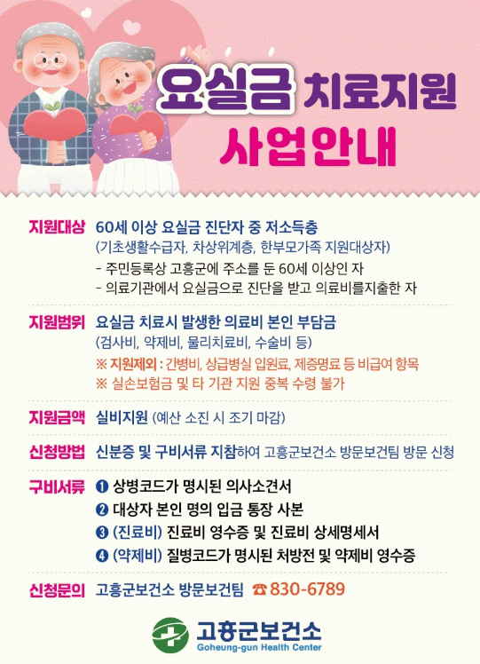 지원 대상은 고흥군에 주소를 둔 60세 이상 어르신 중 의료기관에서 요실금 진단을 받고 치료비를 지출한 ▲기초생활수급자 ▲차상위계층 ▲한부모가족 등 저소득층이다.