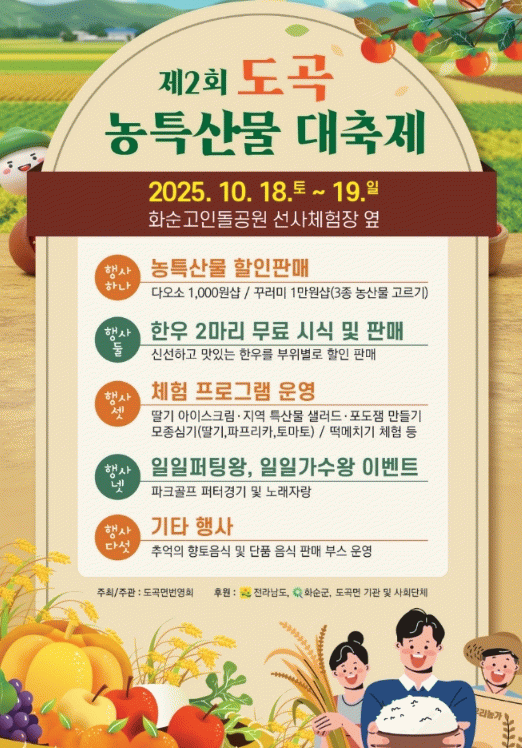 이번 축제는 2025 화순 고인돌 가을꽃 축제와 연계한 동반 행사로 작년 제1회 축제의 성공적인 개최에 이어 올해도 도곡 지역의 우수한 농특산물을 널리 알리고, 지역경제 활성화를 도모하고자 기획됐다.