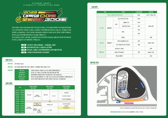 출전 차량은 10kW 이하 전기모터를 장착한 초소형 전기차급 모빌리티로, 성능검사·가속·슬라럼·내구레이싱 등 기술력과 주행성능을 종합 평가하는 경기로 진행된다.