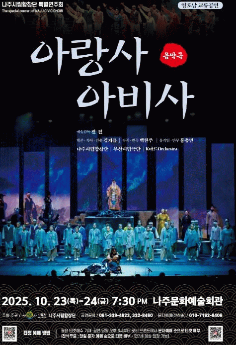 이번 공연은 나주 지역 설화인 ‘앙암바위 전설, 아랑사 아비사’를 바탕으로 한 창작음악극으로 나주의 역사와 정체성을 예술로 풀어낸 대표적인 지역 문화공연이다.