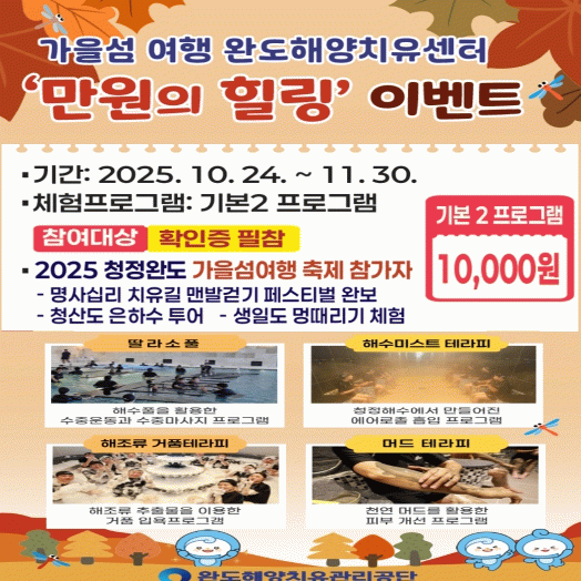 ‘만원의 힐링’ 이벤트는 ‘완도왔섬, 치유됐섬’을 주제로 개최되는 ‘2025 청정 완도 가을 섬 여행’을 하는 관광객이 가을 섬 여행과 함께 부담 없이 해양치유 프로그램을 즐길 수 있도록 마련됐다.
