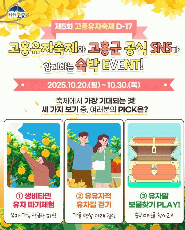 이번 이벤트는 제5회 고흥유자축제의 성공적인 개최와 고흥군 공식 SNS 활성화 및 전국의 관광객들이 고흥의 청정 자연과 맛있는 음식 등 다양하게 고흥을 즐길 수 있는 기회를 제공하기 위해 마련됐다.