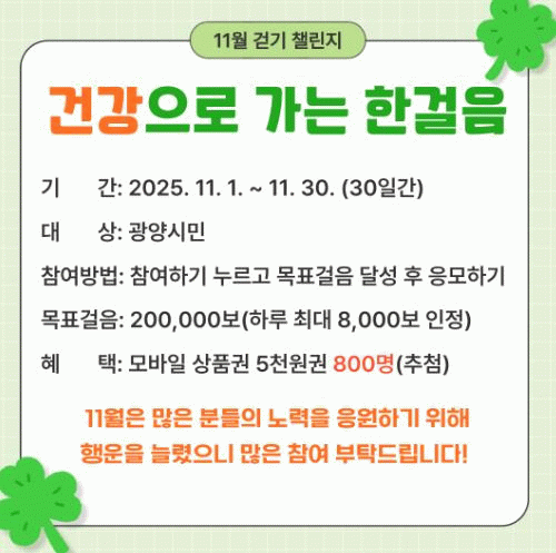 한편, 광양시는 생활 속 움직임을 활성화하고 시민건강증진을 도모하기 위해 모바일 걷기 앱 워크온을 활용한 걷기 챌린지를 매월 운영하고 있다.
