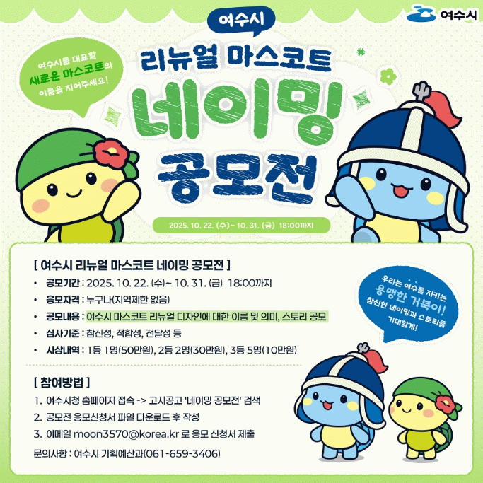 여수시 관계자는 “모두가 공감하고 쉽게 기억할 수 있는 이름이 선정될 수 있도록 많은 관심과 참여를 바란다”며 “여수의 매력과 정체성이 담긴 새로운 마스코트가 탄생하길 기대한다”고 말했다.
