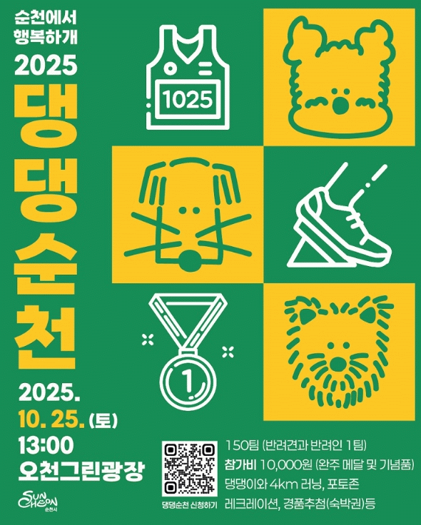 ‘순천에서 행복하개’라는 슬로건 아래 열리는 ‘2025 댕댕순천’은 반려견과 반려인이 함께 ‘오천그린광장 ~ 그린아일랜드 ~ 동천’ 총 4km의 도심 수변을 질주하는 레이스로 진행된다.