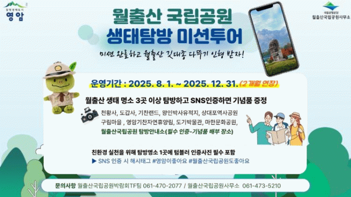 미션이 있는 이 투어는 월출산국립공원을 찾는 모든 관광객들이 참여할 수 있는 프로그램으로, 영암 생태탐방 명소를 3곳 이상 방문하거나, 2곳 방문 및 체험·숙박·구매 영수증 1매 이상 제출하면 된다.