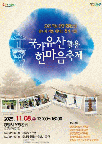 김명덕 문화예술과장은 “이번 국가유산 활용 한마음 축제는 시민과 함께 광양의 국가유산이 지닌 가치를 되새기고, 쌍사자 석등 제자리 찾기의 의미를 공유하는 뜻깊은 자리”라며 “앞으로도 지역의 문화유산을 활용한 다양한 프로그램을 통해 광양의 역사와 문화를 널리 알리겠다”고 말했다.
