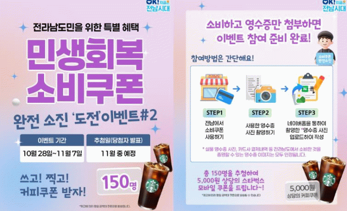 이번 이벤트는 소비쿠폰을 사용한 전남 도민 중 150명을 추첨해 5천 원 상당의 커피쿠폰을 증정하는 행사다.