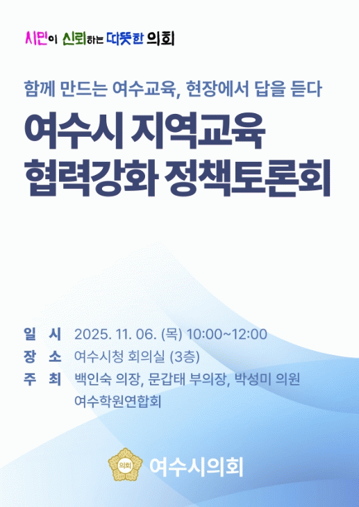 이번 토론회는 백인숙 의장, 문갑태 부의장, 박성미 의원과 여수학원연합회가 공동 주최하며, 여수시 관계자와 학부모, 교육단체, 시민들이 함께 참여해 여수교육의 현안을 공유하고 해결방안을 모색한다.