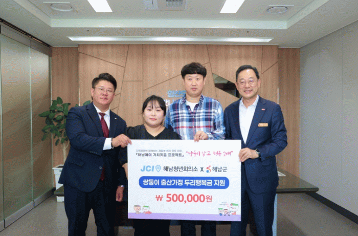이번 전달식에는 명현관 해남군수, 이보훈 해남청년회의소 회장과 김민수 사무국장이 참여해 이효동·김해주 출산가정에 두리행복금을 전달했다.