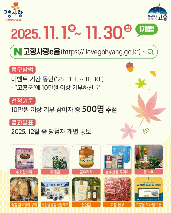 이번 이벤트는 연말정산 시즌을 앞두고 기부자들의 관심이 높아지는 시기에 맞춰 마련된 것으로, 기간 내 고흥군에 10만 원 이상 기부한 참여자 중 500명을 무작위로 추첨해 다이소 모바일 상품권(1만 원권)을 증정한다.