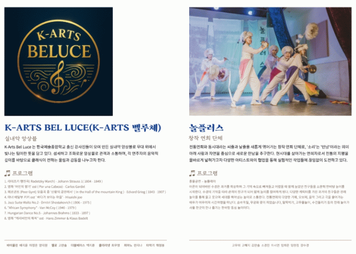 이번 공연에서는 오케스트라 강사진으로 구성된 ‘K-ARTS 벨루체’팀의 실내악 앙상블 공연뿐 아니라 ‘놀플러스’팀의 창작 연희 공연도 함께해 클래식과 국악이 어우러진 멋진 공연이 기대된다.