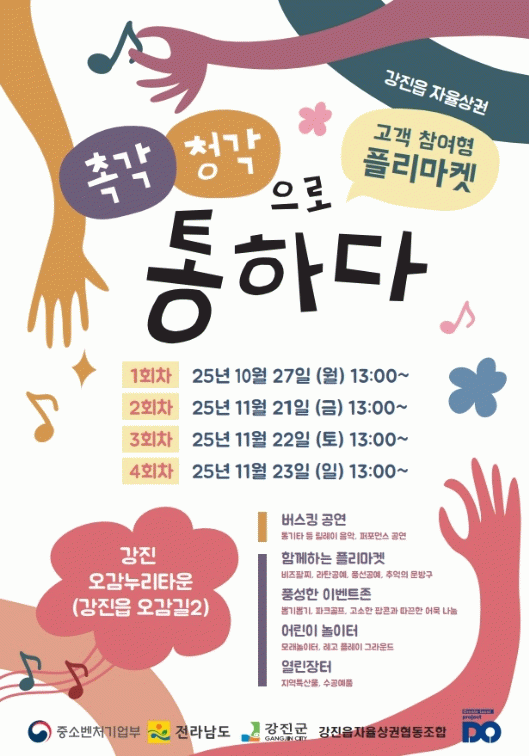 강진읍 자율상권협동조합 김동수 이사장은 “이번 행사는 강진읍 중심상권의 활력을 높이고, 청년과 상인이 함께 성장하는 지역 경제 모델을 만드는 계기가 될 것”이라며 “군민과 방문객 모두 즐겁게 참여해 지역 상권 활성화에 힘을 보태주길 바란다”고 말했다.