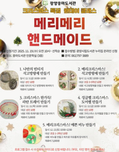 세부 강좌는 ▲초등 1~3학년 대상 ‘메리크리스마스! 예쁜 비누 만들기’ ▲초등 3~5학년 대상 ‘메리크리스마스! 석고 방향제 만들기’ ▲성인 대상 ‘나만의 빈티지 석고 방향제 만들기’ ▲‘크리스마스 한가득! 라탄 트레이 만들기’ ▲‘징글벨 크리스마스 도어벨 만들기’ 총 5개다.