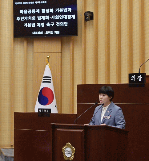 오 의원은 “마을공동체 활동은 지역의 문제를 가장 먼저 인식하고 대응하는 생활 기반이며, 주민자치회는 생활 속 민주주의를 실현하는 핵심 제도”라고 강조했다. 이어 “사회연대경제는 경쟁 중심 시장경제가 해결하지 못한 사람중심의 돌봄·복지·고용 분야를 보완하는 중요한 대안이지만, 이를 지원할 법이 여전히 부재하다”고 지적했다.