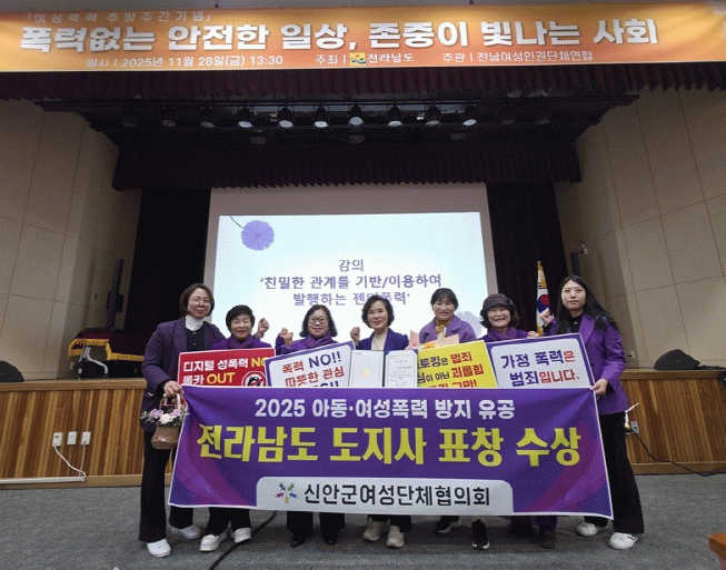 이번 수상은 신안군여성단체협의회가 신안군, 신안경찰서, 전남여성가족재단 등 4개 기관과 업무협약(MOU)을 체결하고 지역사회 안전망을 강화하는 데 주도적인 역할을 수행한 공로가 높게 평가된 결과다.
