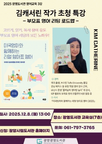 이번 특강에서 김캐서린 작가는 ‘부모표 영어 리딩 로드맵’을 중심으로, 자녀 영어교육에서 부모의 역할, 영어책 선택법, 효과적인 리딩 방법 등 미국 원어민이 실제로 활용하는 영어 학습 전략을 구체적으로 소개할 예정이다.