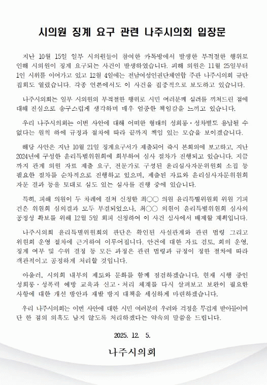 입장문에서 의회는 일부 시의원의 부적절한 행위로 시민들에게 심려를 끼친 데 대해 깊이 사과하며, 이번 사안을 매우 엄중하게 인식하고 있다고 밝혔다.