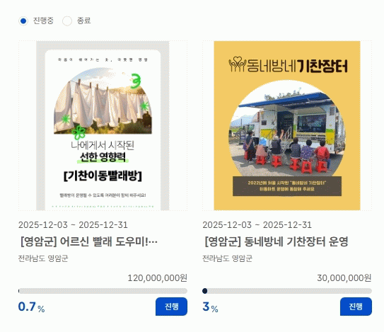 우승희 영암군수는 “지정기부는 기부자가 공감하는 사업을 선택해 후원할 수 있는 제도다. 이미 마을주민에게서 효능감을 입증한 기찬이동빨래방과 기찬장터에 많은 응원과 기부바란다”고 전했다.