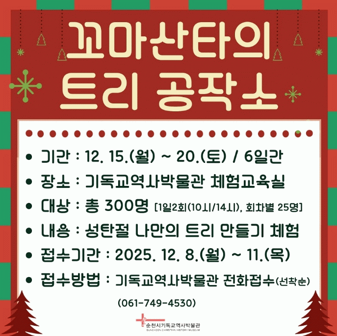 이번 프로그램은 성탄의 의미를 함께 나누고 추억을 만들기 위한 체험형 프로그램으로 참가자들이 나만의 소형 크리스마스트리를 직접 꾸미고 완성하는 활동으로 구성된다.