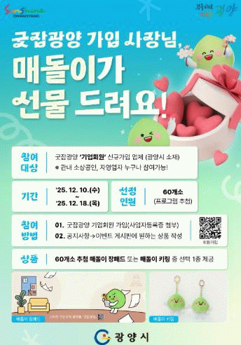 총 60개 업체를 추첨해 12월 22일 굿잡광양 누리집에 결과를 게시하며, 당첨 기업에는 매돌이 장패드 또는 매돌이 키링 중 1종이 제공된다.