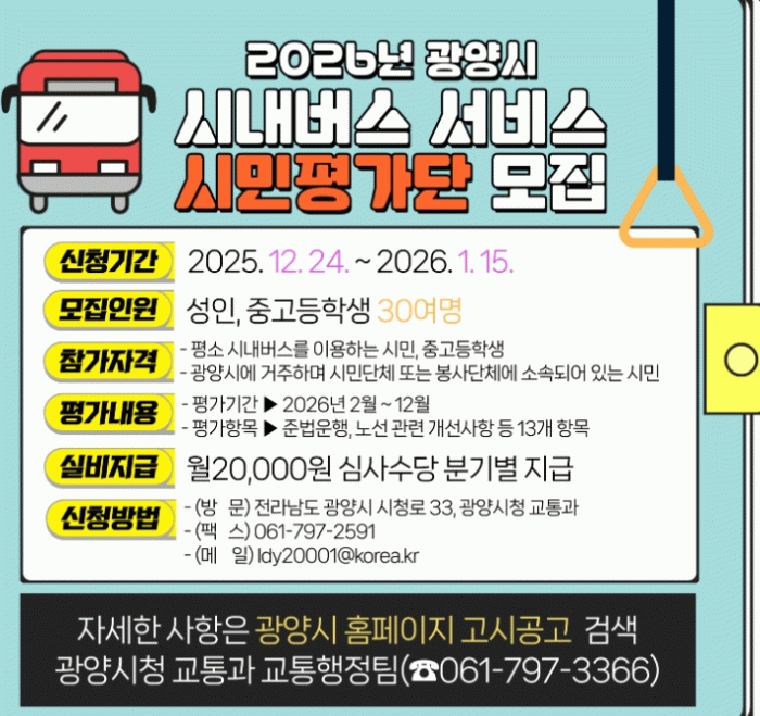 모집 기간은 2026년 1월 15일까지이며, 참여를 희망하는 시민은 광양시 누리집 공고란에서 신청서를 내려받아 작성한 뒤, 광양시 교통과에 방문하거나 팩스, 전자우편 등의 방법으로 제출하면 된다.