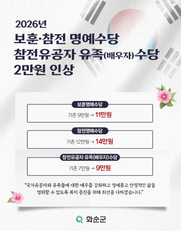 이번 인상 대상은 ▲보훈수당 ▲참전명예수당 ▲참전유공자 유족(배우자)수당으로, 각각 월 2만 원씩 인상된다.