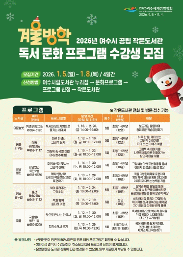 시 관계자는 “이번 겨울방학 프로그램은 독서와 문화를 함께 누릴 수 있는 다채로운 프로그램을 통해 어린이에게 창의적인 활동과 풍부한 문화적 경험을 제공하기 위해 마련됐다”며 “가까운 작은도서관에서 방학을 더욱 의미 있게 보내길 바란다”고 전했다.