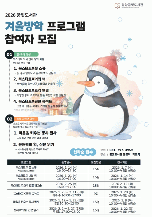 광양시 관계자는 “겨울방학 동안 아이들이 책과 더욱 친숙해지고, 놀이처럼 즐기며 독서 경험을 확장할 수 있도록 프로그램을 준비했다”며 “체험과 읽기를 균형 있게 결합한 이번 프로그램이 어린이들의 성장에 도움이 되길 바란다”고 말했다.