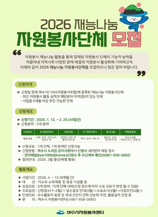 한편, 여수시는 지난해 5개 분야의 10개 재능나눔 봉사단체를 선발해 집수리 사업, 소외계층 1인 가구 밑반찬 지원, 이·미용 및 의료서비스 제공, 2026 여수세계섬박람회 홍보 벽화 그리기 등을 추진했다.