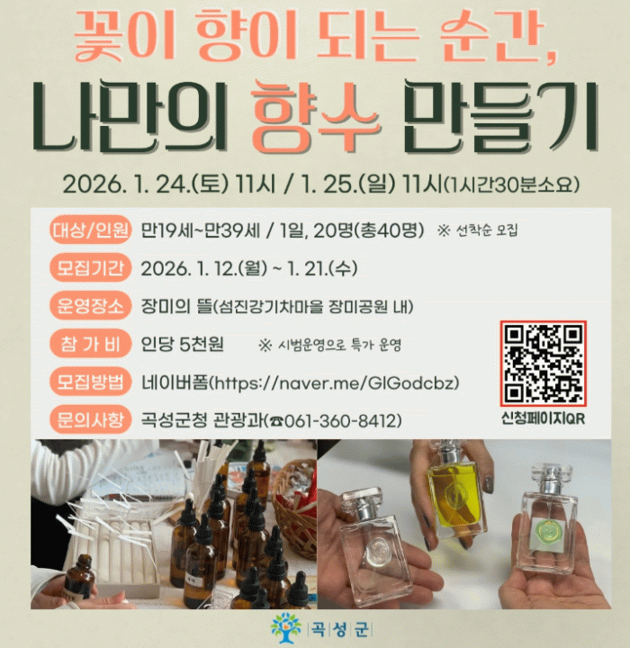 ‘나만의 향수 만들기’ 프로그램은 만 19세부터 만 39세까지를 대상으로 1월 24일과 25일 이틀간 운영된다.