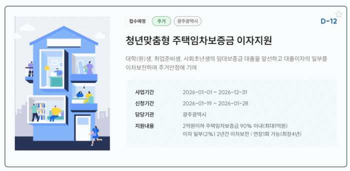 이 사업은 청년이 전‧월세 임차보증금을 대출할 때 발생하는 이자를 일부 지원하는 사업이다. 광주시가 대상자를 선정하면 광주은행이 대출을 실행하고 한국주택금융공사가 대출을 100% 보증한다.