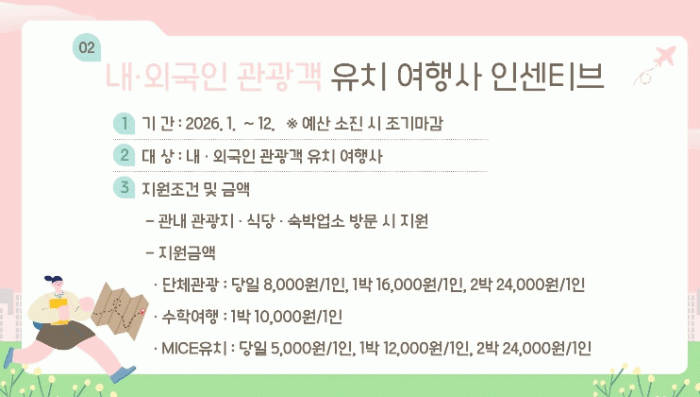 지원 금액은 단체관광 기준으로 당일 관광 시 1인당 8천 원, 1박 1만6천 원, 2박 2만4천 원이며, 수학여행은 1박 기준 1인당 1만 원이 지원된다.