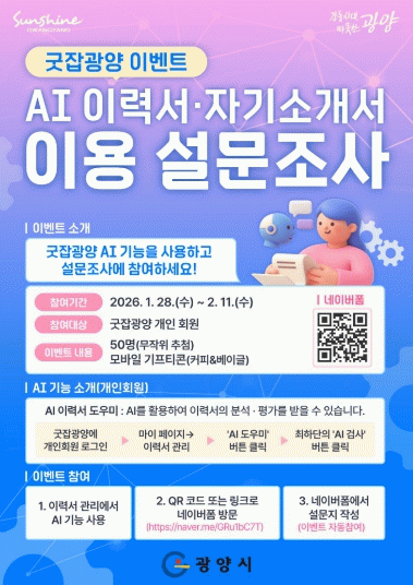 이번 이벤트는 1월 28일부터 2월 11일까지 진행되며, 굿잡광양 누리집에 이력서를 등록하고 AI 도우미 기능을 활용한 개인회원이라면 누구나 설문조사에 참여할 수 있다.