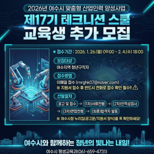 여수시 관계자는 “테크니션 스쿨은 지역 산업 현장에서 바로 활용 가능한 실무형 인재 양성에 중점을 두고 있다”며, “취업을 준비 중인 지역 청년들의 많은 관심과 적극적인 참여를 바란다”고 전했다.