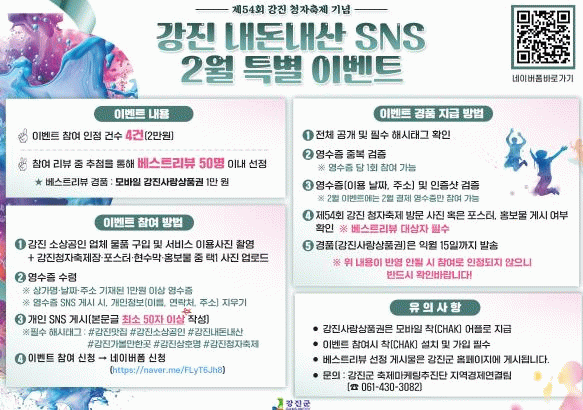 이벤트 참여 방법은 ①강진군 소상공인 업체 이용 또는 구매 사진 및 청자 축제 홍보 사진(홍보물, 포스터, 현수막 등) 촬영 ②1만 원 이상 영수증 사진 촬영 ③개인 SNS에 필수 해시태그와 사진들을 게시한 후 본문글 최소 50자 이상 작성(전체 공개 및 필수 해시태그 : #강진맛집 #강진소상공인 #강진내돈내산 #강진가볼만한곳 #강진상호명기재 #강진청자축제) ④이벤트 참여 신청(네이버폼)순서로 참여해야 한다.