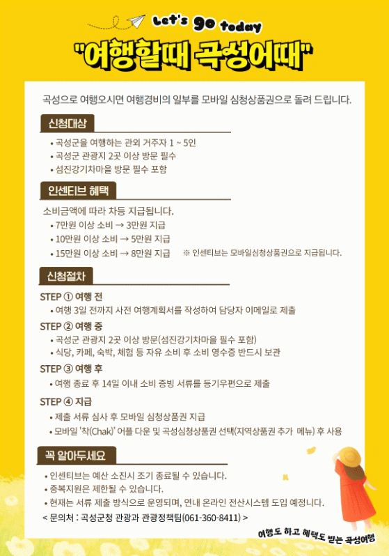 참여 방법도 간단하다. 여행 3일 전까지 사전 여행계획서를 담당자 이메일로 제출한 후 곡성 여행을 즐긴 후 여행 종료 후 14일 이내 소비 영수증 등 증빙서류를 등기우편으로 제출하면 된다. 심사 후 모바일 심청상품권 지급하게 된다. 현재는 서류 제출 방식으로 운영하고 있으나, 군은 올해 안으로 온라인 전산 시스템을 구축해 신청부터 지급까지 더 쉽고 편리하게 개선할 계획이다.