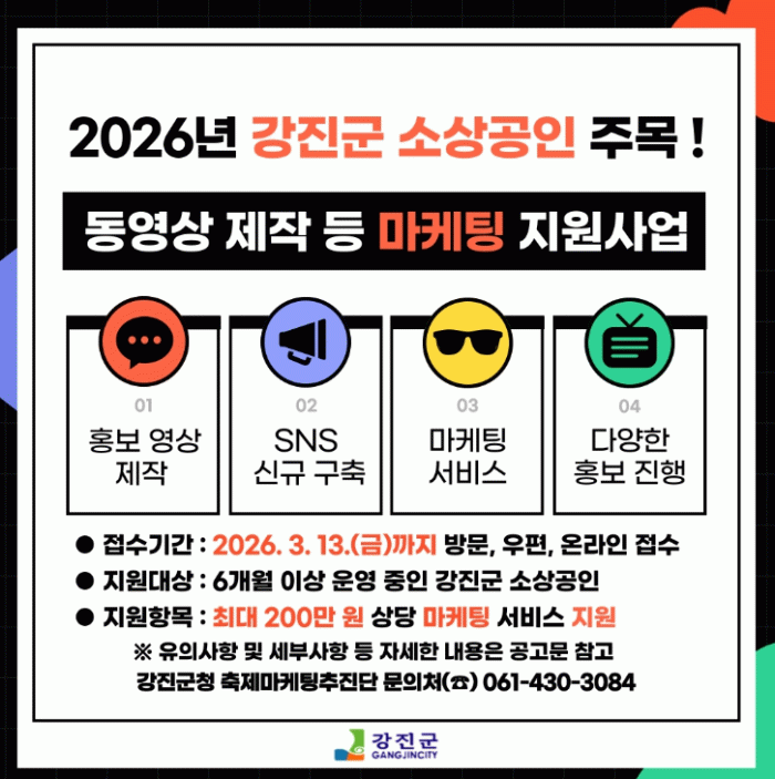 신청은 오는 3월 13일 까지 강진군청 축제마케팅추진단 방문 또는 등기우편 접수, 강진군 누리집 ‘소상공인지원센터’를 통한 온라인 접수도 가능하다.