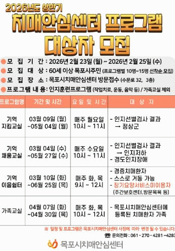 프로그램 일정은 센터 사정에 따라 일부 변경될 수 있으며, 자세한 사항은 목포시 치매안심센터로 문의하면 된다.