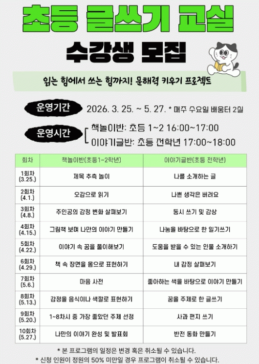 책놀이반은 다양한 책놀이 중심 활동을 통해 기초 문해력을 자연스럽게 익히도록 돕고, 이야기글반은 주제 탐구와 글쓰기 활동을 통해 사고력과 표현력 향상에 중점을 두고 운영될 예정이다.