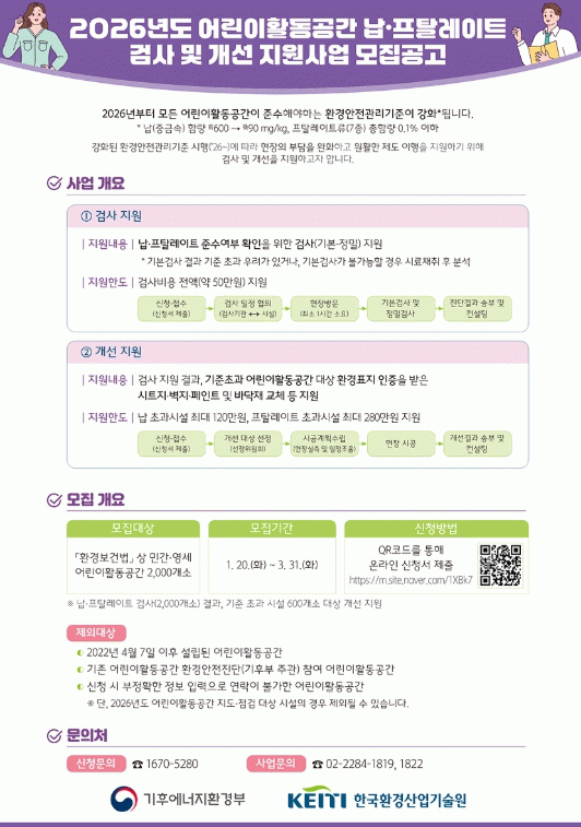 기후에너지환경부 주관으로 추진되는 이번 사업은 전국 2,000개소를 대상으로 납·프탈레이트 무료 검사를 지원한다.