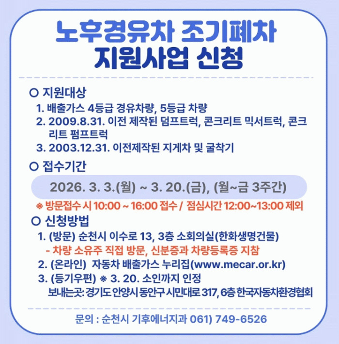 신청일 기준 순천시에 6개월 이상 연속 등록되어 있고, 6개월 이상 소유한 차량에 대해 차종·연식·형식 등에 따라 보조금을 차등 지원한다.