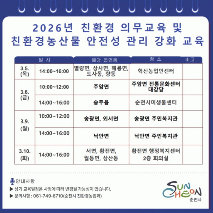 시 관계자는 “이번 의무교육은 친환경 인증과 연계된 제도 변화에 대응하기 위한 자리”라며 “앞으로도 친환경농업 확대와 안전한 농산물 생산 기반 조성에 지속적으로 노력하겠다”고 밝혔다.