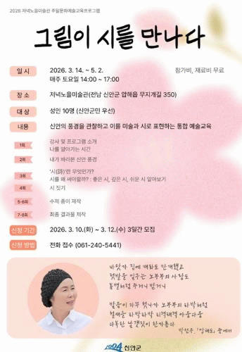 저녁노을미술관 관계자는 “지역 예술가와의 연계를 통해 주민들이 수준 높은 문화예술교육을 경험할 수 있도록 준비했다”라며 “신안의 자연과 깊이 교감하며 자신만의 시를 창작하고, 표현의 기쁨을 느끼는 소중한 시간이 되길 기대한다”라고 밝혔다.