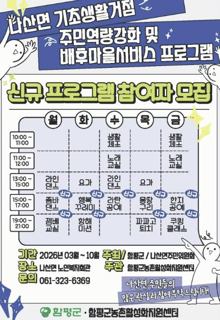 이번 프로그램은 나산면 기초생활거점 조성사업의 일환으로, 주민 삶의 질 향상과 지역 공동체 활성화를 위해 마련됐다.