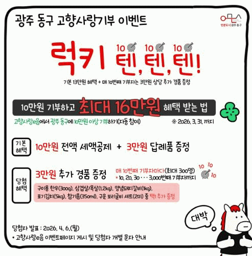 누적 기부 순서 기준으로 10번째, 20번째, 30번째 등 매 10번째 기부자에게 3만 원 상당의 답례품을 추가 제공하며, 최대 3,000번째 기부자까지 총 300명이 혜택을 받게 된다.