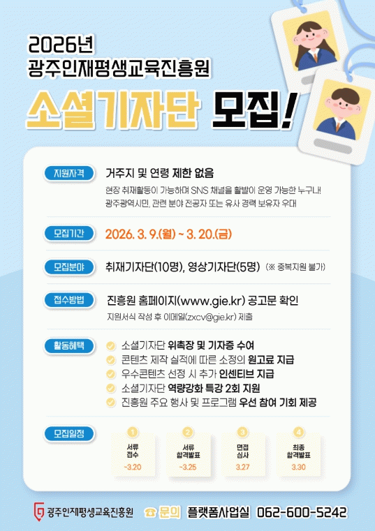 광주인재평생교육진흥원 송형길 원장은 “시민의 시선으로 기록되는 이야기가 지역 학습문화를 더욱 풍성하게 만들 것”이라며 “미디어 소통 역량을 갖춘 인재들의 많은 참여를 기대한다”고 말했다.
