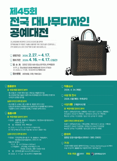 일반부는 대나무와 다른 소재를 결합한 현대적 창작 실물 작품을, 대학생부는 담양이나 대나무 공예를 상징하는 기념품 디자인 파일을 제출하면 된다.