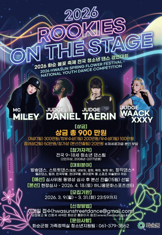 경연 종목은 방송댄스, 스트리트댄스, 창작댄스 중 자유롭게 선택할 수 있다. 접수 기간은 2026년 3월 31일까지이며, 참가 신청서와 댄스 동영상을 이메일로 제출하면 된다.